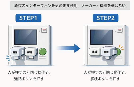 人がインターホンを操作するのと同じ手順を、遠隔から安全に再現します。