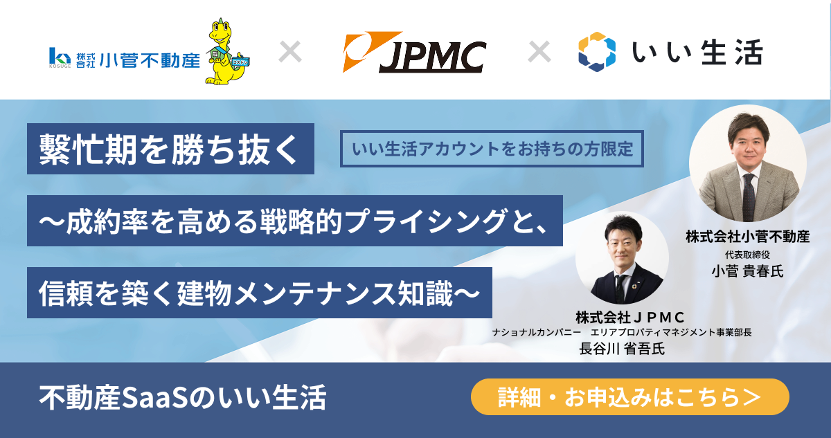不動産業務を網羅するバーティカルSaaSと業務効率を推進するBPaaS(※1)で不動産市場のDXを推進する株式会社いい生活(東京都港区、代表取締役社長 CEO:前野 善一、東証スタンダード:3796、以下:いい生活)は、1月30日(金)16時から無料セミナー『繁忙期を勝ち抜く 〜成約率を高める戦略的プライシングと、信頼を築く建物メンテナンス知識〜』を開催いたします。