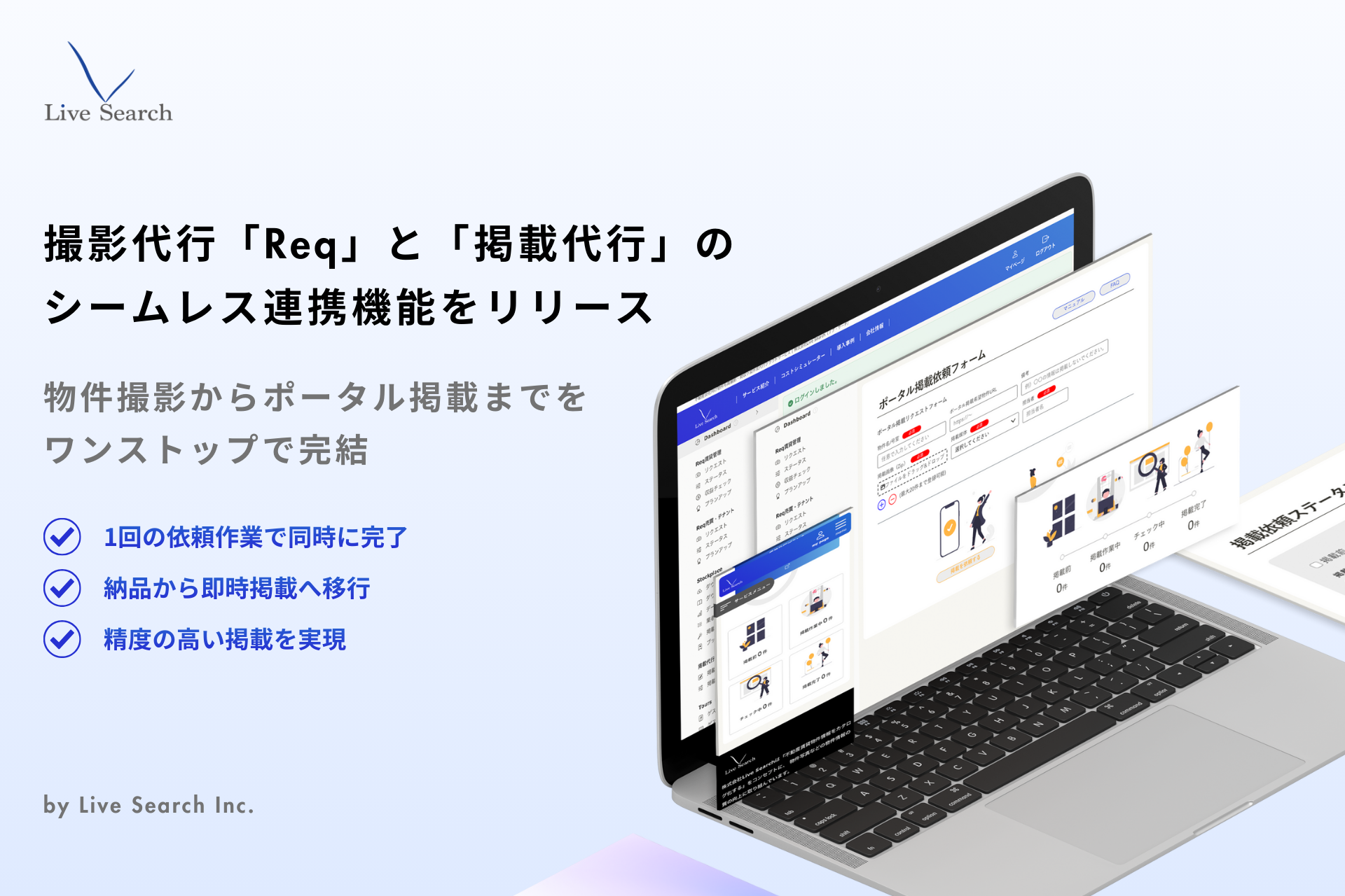 不動産業界向けに物件撮影代行サービスやデータプラットフォームといったBPaaSを展開する株式会社Live Search(本社:福岡県福岡市中央区、代表取締役:福井 隆太郎、以下「リブ・サーチ」)は、運営する物件撮影・間取り図作成代行サービス「Req(レック)」において、提供中の「掲載代行サービス」との連携機能をリリースしたことをお知らせいたします。