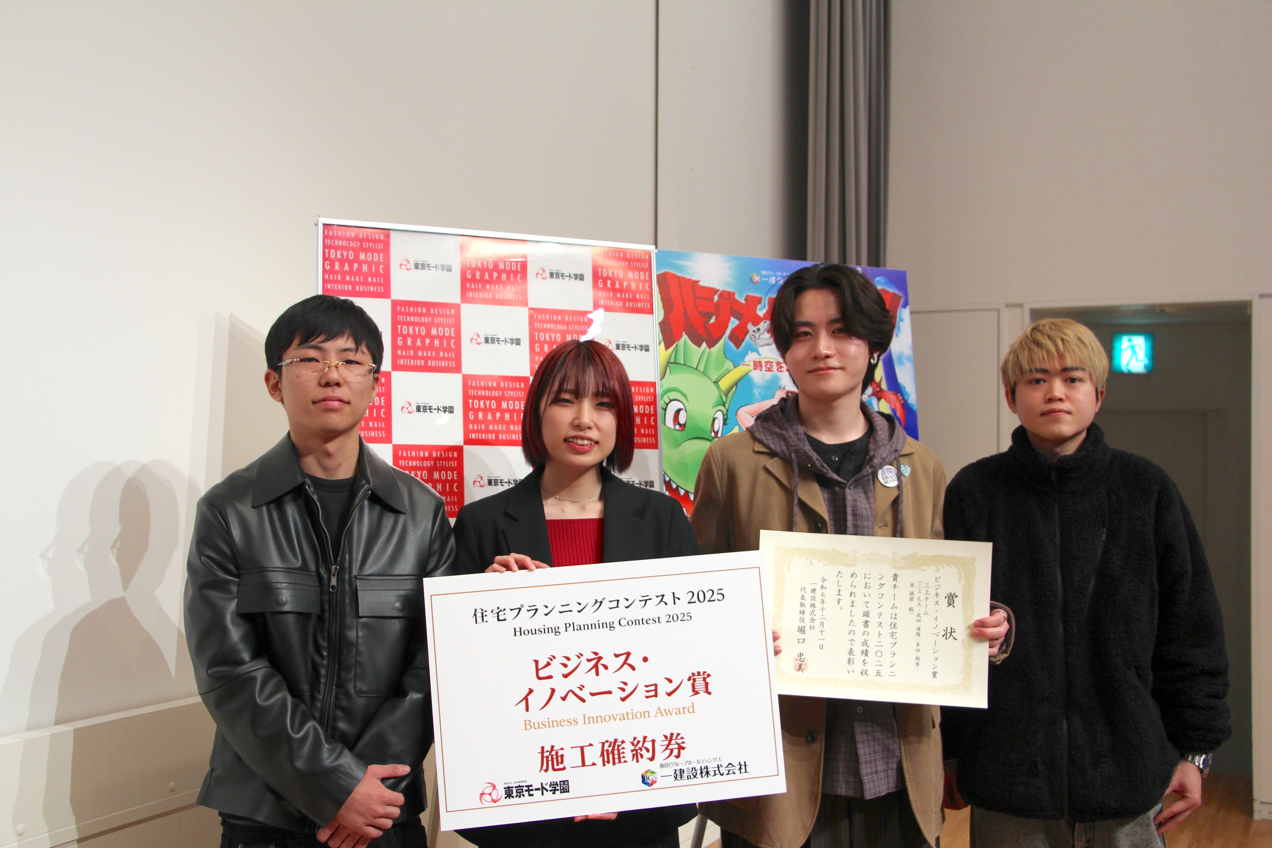 また、本取り組みは、学生が提案した住宅プランを、実際の建売住宅として施工する実践的なプロジェクトでもあり、優れたアイデアが“リアルな住宅”として形になる点が大きな特徴です。審査は一建設の社員および東京モード学園の教師が担当し、最優秀作品に加え、学生の住宅プランを実際に施工する「ビジネス・イノベーション賞」を決定しました。