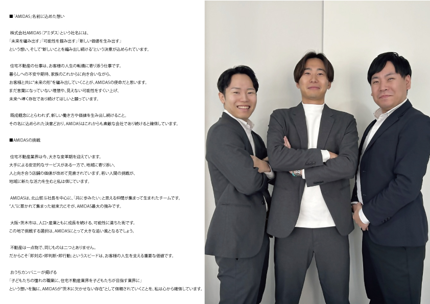 私たち株式会社AMIDASは、大阪府茨木市を拠点に、住宅不動産を通じてお客様の人生と真正面から向き合う会社です。