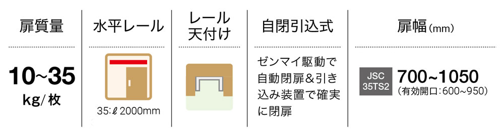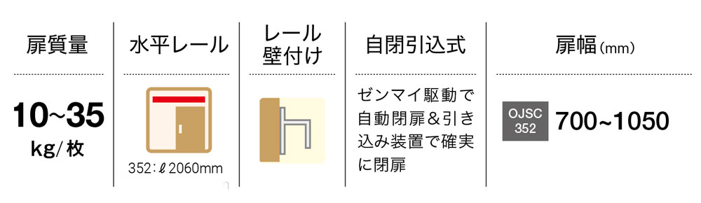 今回の新製品は、アウトセット仕様のレール壁付けタイプ「HCS-OJSC352」と、レール天付けタイプの「HCS-JSC35TS2」の2種類。いずれもアルミレール、吊車、駆動装置などの必要部品がセットになっています。(扉は別途必要です。)対応扉は木製のみ、扉質量は1枚あたり10~35kgに対応します。