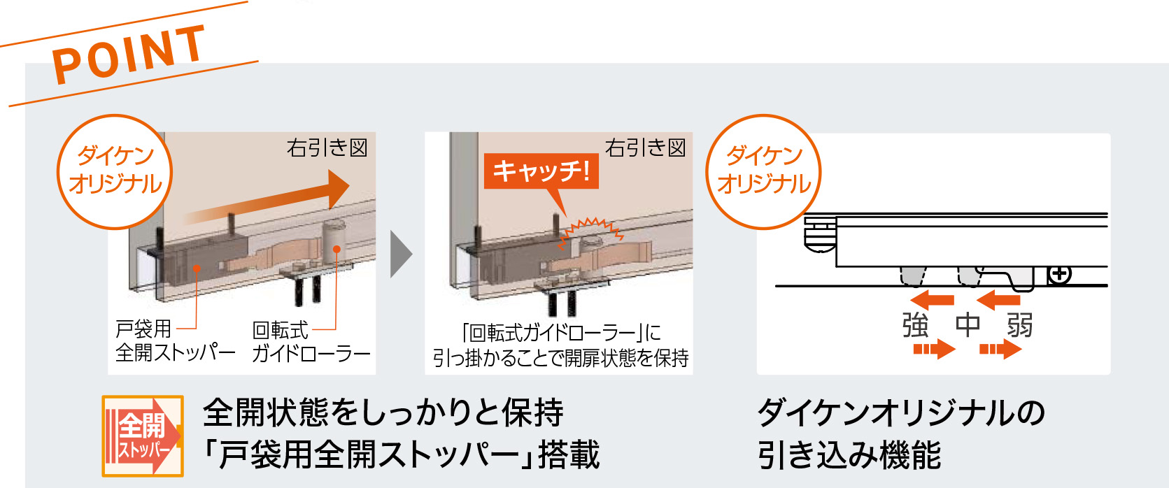引き込み力は3段階(強・中・弱)で調整可能。「戸袋用全開ストッパー」、「引き込み機能」ともにダイケンオリジナル機構です。