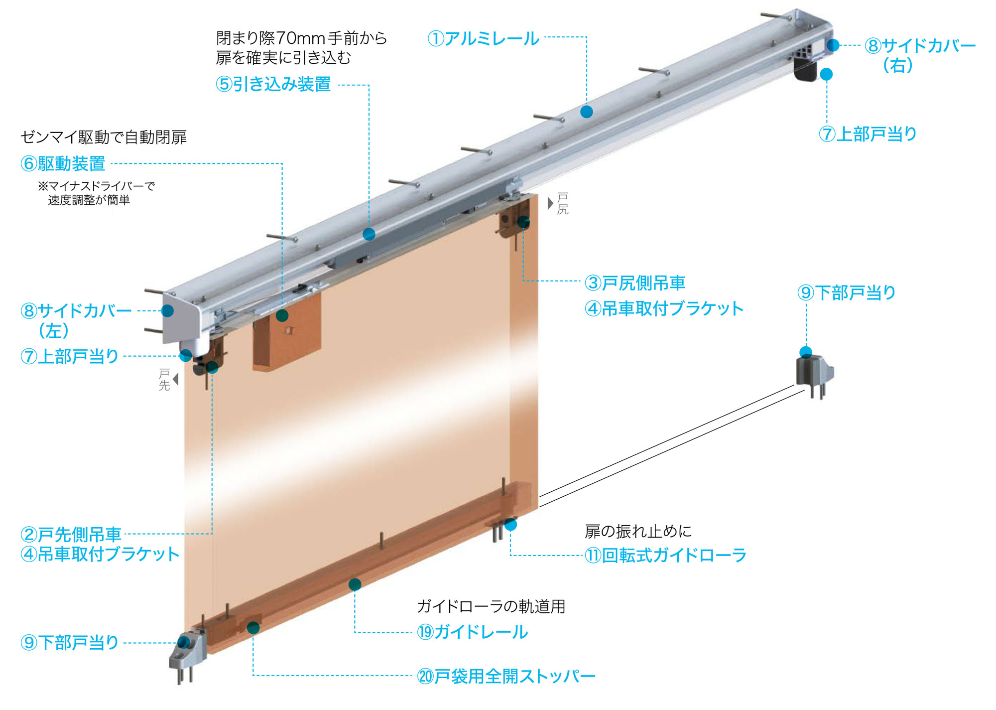 開けた扉が自動でゆっくり閉まる装置。公共施設・一般住宅の両方に対応。