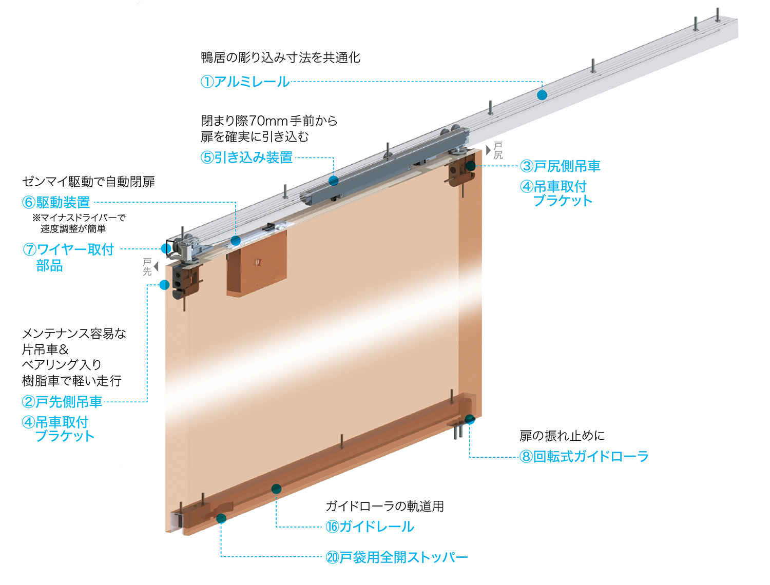 扉の全開状態を保持できる「戸袋用全開ストッパー」を搭載。また、「引き込み機能」を備えており、扉の閉まり際約70mm手前の位置で引込装置が作動し、確実に閉扉します。