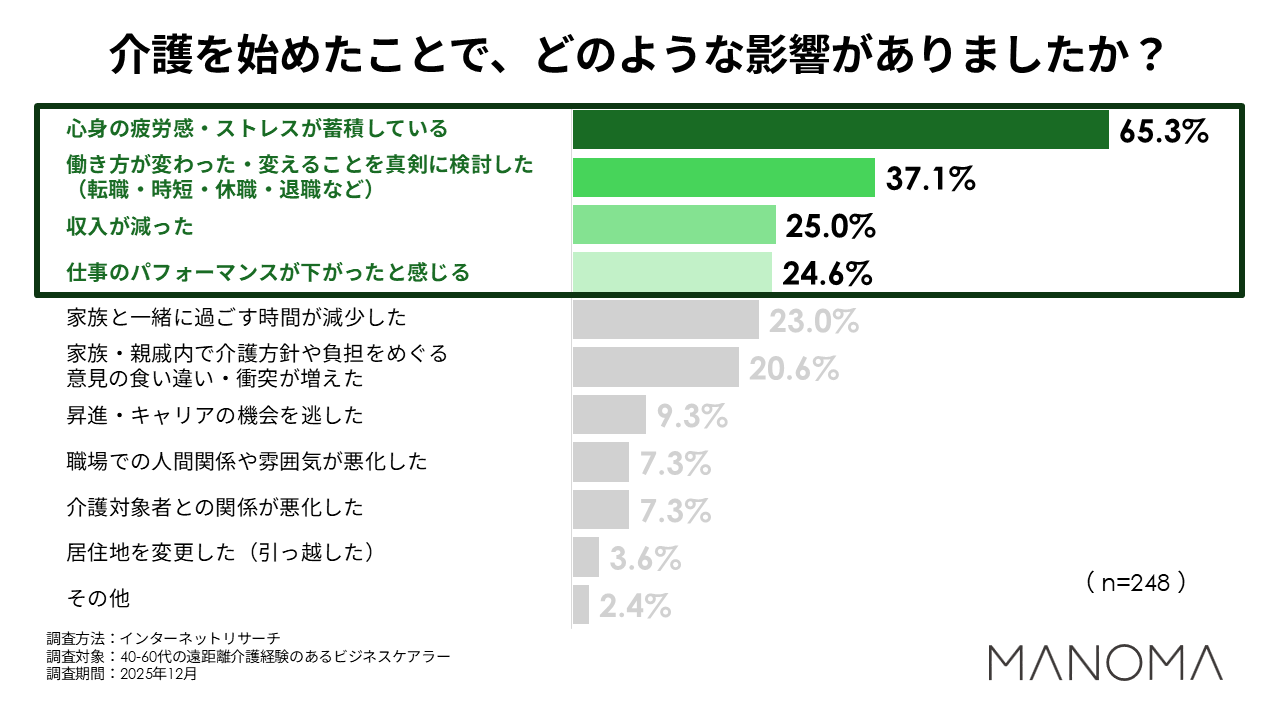 【図7】遠距離介護での仕事や家族への影響内容(複数回答)(n=248)