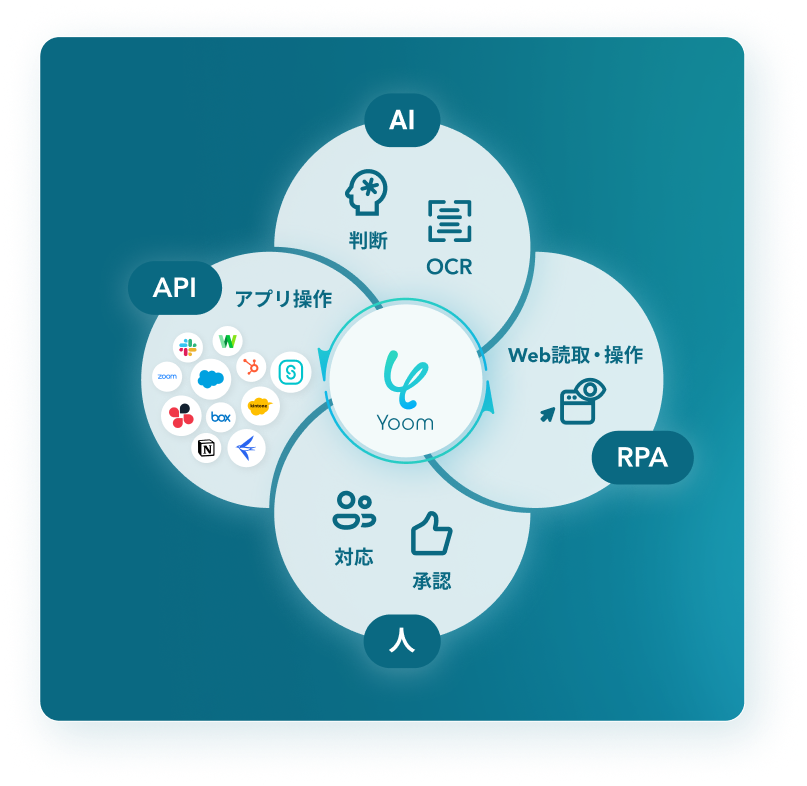 YoomはAI・API・RPA・OCRなどの様々な技術を組み合わせ、セールス・人事・労務・経理など企業内のあらゆるデスクワークを自動化するハイパーオートメーションツールです。現在700種以上のアプリ・サービスと連携しており、従来のRPAだけでは難しかった多くの事務作業を簡単に自動化することが可能です。