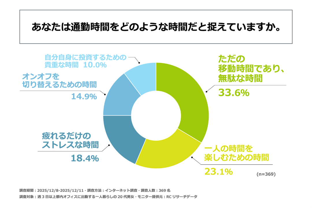都内で働く一人暮らしの20代の男女のうち、通勤時間を「ただの移動時間であり、無駄な時間」や「疲れるだけのストレスな時間」と捉えている人が半数以上いる一方で、「一人の時間を楽しむための時間」と捉えている人も2割以上いる