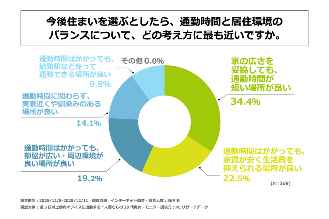 都内で働く一人暮らしの20代の男女の約65%が、今後の住まい選びにおいて「通勤時間よりも居住環境を優先したい」と考えている