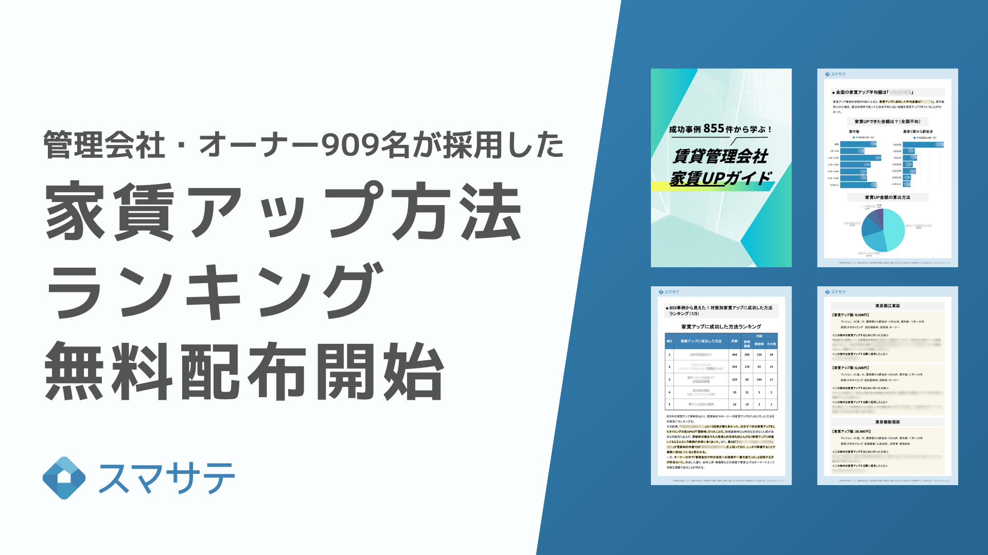AI賃料査定システム「スマサテ」を提供するスマサテ株式会社(本社:東京都品川区、代表取締役社長:山岸 延好)は、賃貸管理会社・賃貸不動産オーナー909人の家賃アップ事例をまとめた資料「成功事例から学ぶ!賃貸管理会社家賃UPガイド」の無料配布を開始しました。
