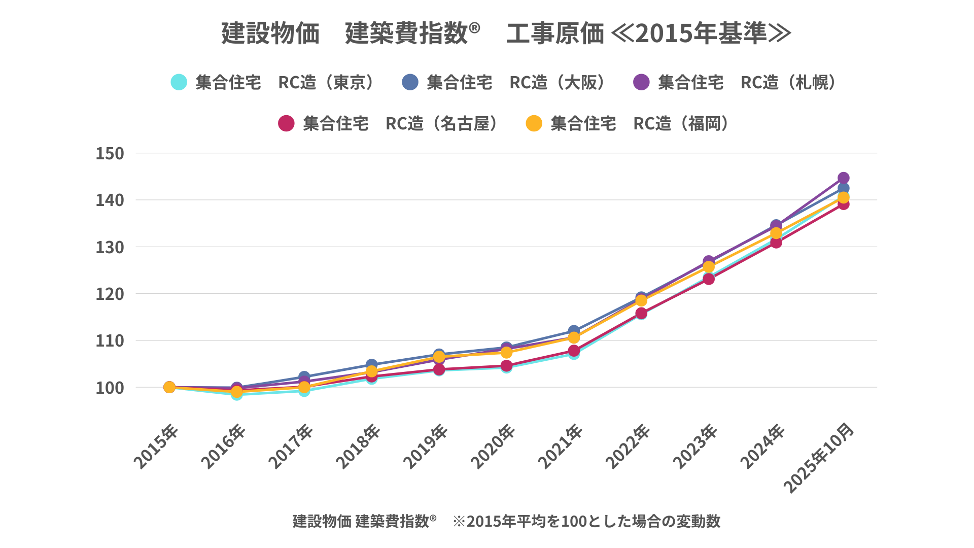 一般社団法人建設物価調査会によると、建築に関わる工事原価はここ数年急速に上がり続けており、2015年と比べ約1.5倍へ高騰(※1)。さらに人件費もコロナ禍で一時的に下がったものの再度上がり出しており(※2)、賃貸物件に関わる全体的に経費は上がり続けています。