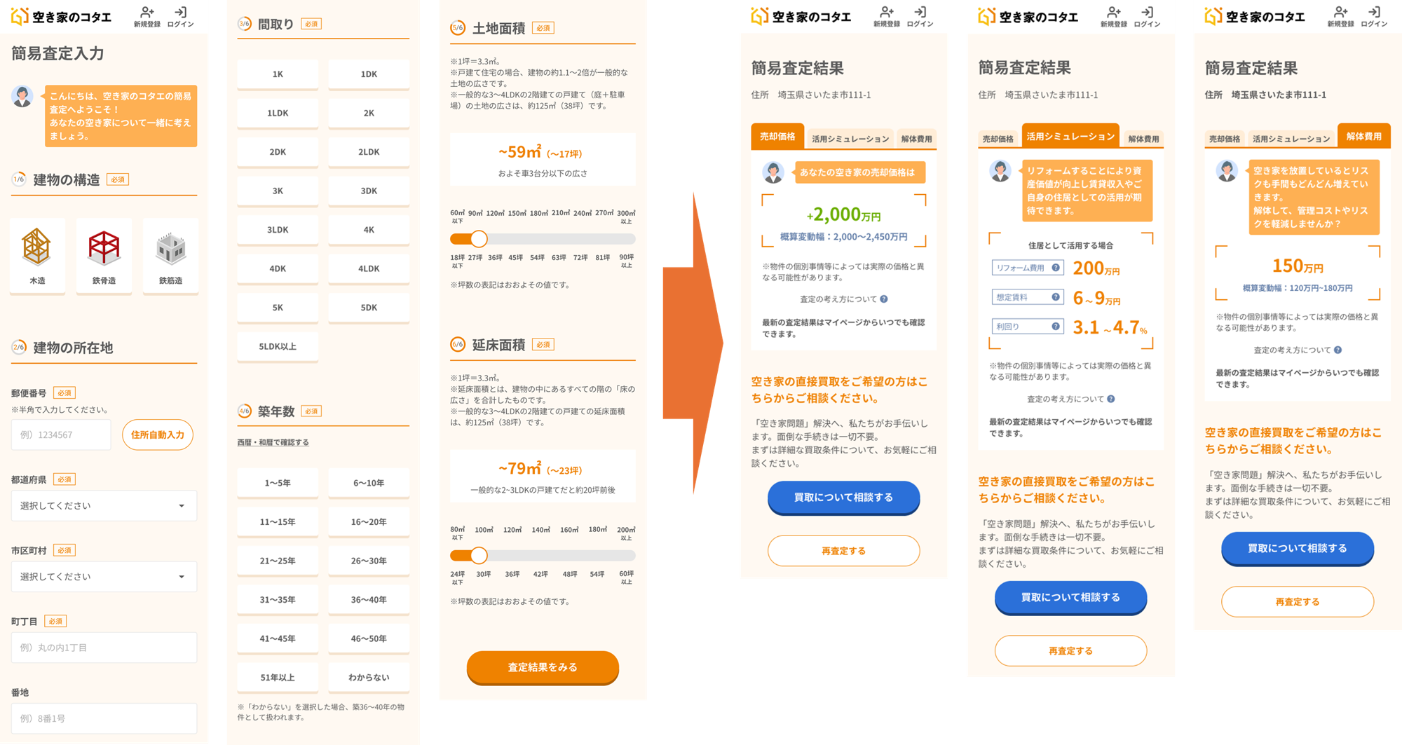 本サービスでは、入力項目を所有者が迷わず回答できる内容に厳選し、手軽さにこだわりました。Web上で物件の所在地や築年数、構造、延床面積などの基本情報を入力するだけで、AIが空き家の価値を多角的に算出し、売却した場合の想定価格や、賃貸・リノベーションによる活用を想定した収益シミュレーション、さらには解体にかかる概算費用までを提示します。これにより、空き家所有者は、納得感をもって複数の選択肢を比較・検討することが可能となります。