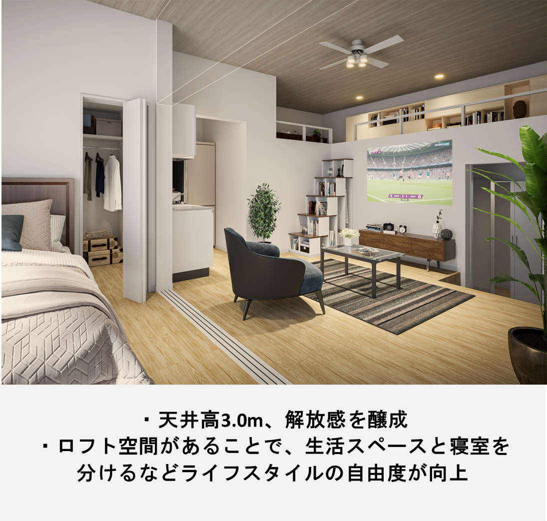 本商品の特長である「ロフト」には、これまで多くの入居者様にご支持いただいてきた当社独自の空間設計ノウハウを採用しています。全室に完備されたロフトは、限られた専有面積を立体的に広げ、入居者様に「図面以上の広さ」を提供するとともに、ロフトへの階段は単なる梯子ではなく、階段機能を有した収納を配置することで、スペースを有効活用しています。