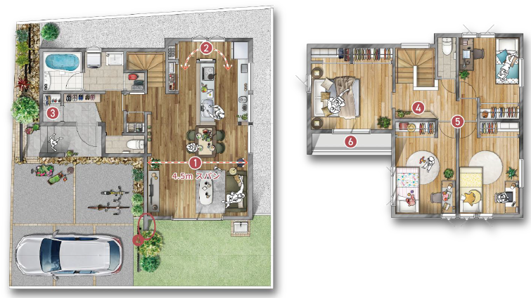 ① 4.5m スパンの大空間リビングダイニング
