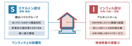 本事業では、木造住宅のスケルトン部分(基礎・構造躯体)を積水ハウスグループが設計・施工して、アルネットホームがインフィル部分(外装・内装・設備)を施工することで、両社の優れた部分を掛け合わせた新しい住まいづくりの選択肢です。