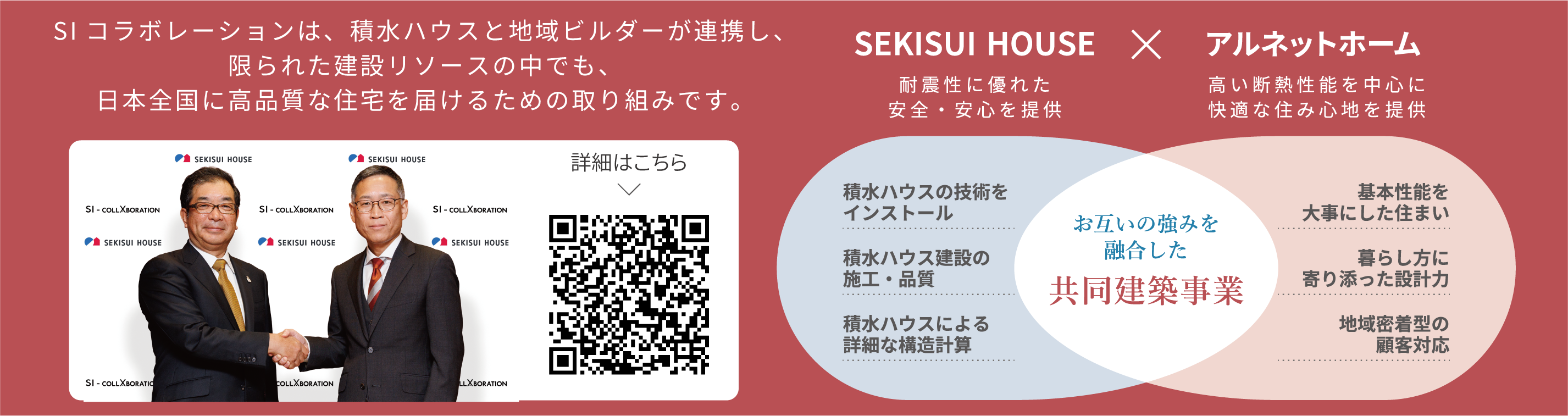 SI-COLLABORATIONとは、積水ハウスと地域ビルダーが連携し、限られた建築リソースを最大限活用し、日本全国に高品質な住宅の供給を目指す取り組みです。両社の強みを融合させることで、より多くの持続可能な家づくりの普及で豊かな暮らしに貢献したくSI事業締結に至りました。