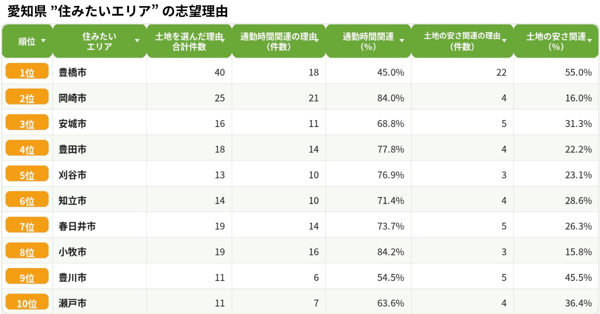 ・総合ランキング1位の豊橋市は、「土地の安さ関連」が55.0%と最多で、価格面の優位性が選好を牽引。豊橋は通勤時間関連も45.0%あり、“安さ×利便”の両立が支持されました。