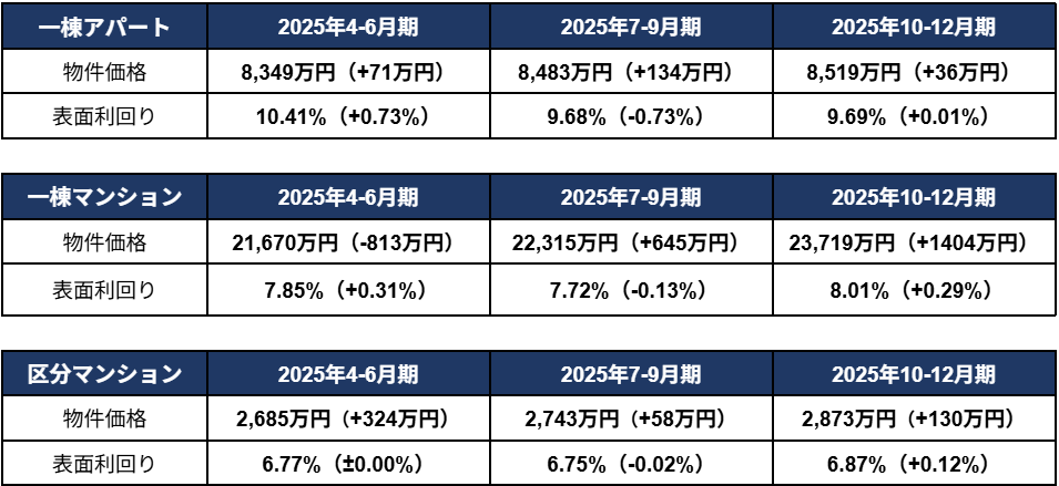 ・一棟アパート、一棟マンション、区分マンションの価格が、集計開始以来の過去最高額を更新