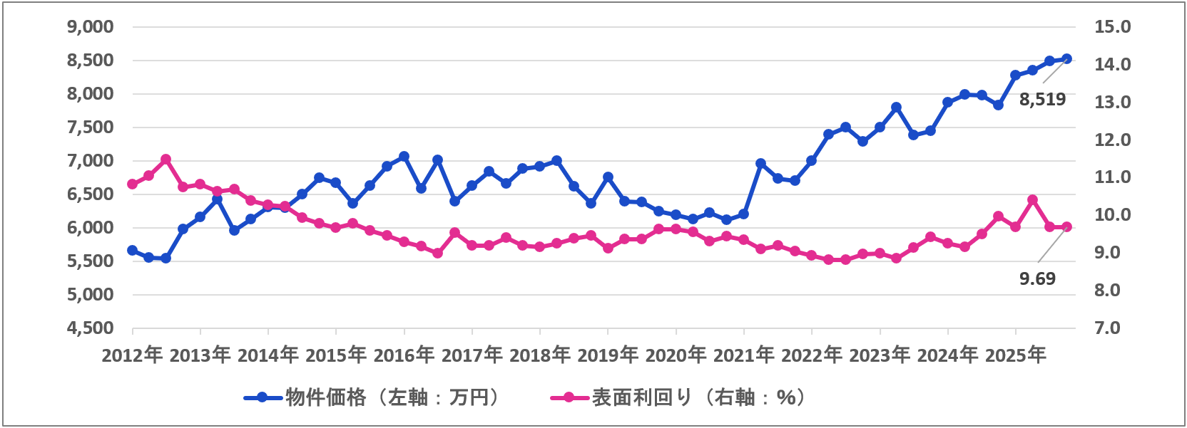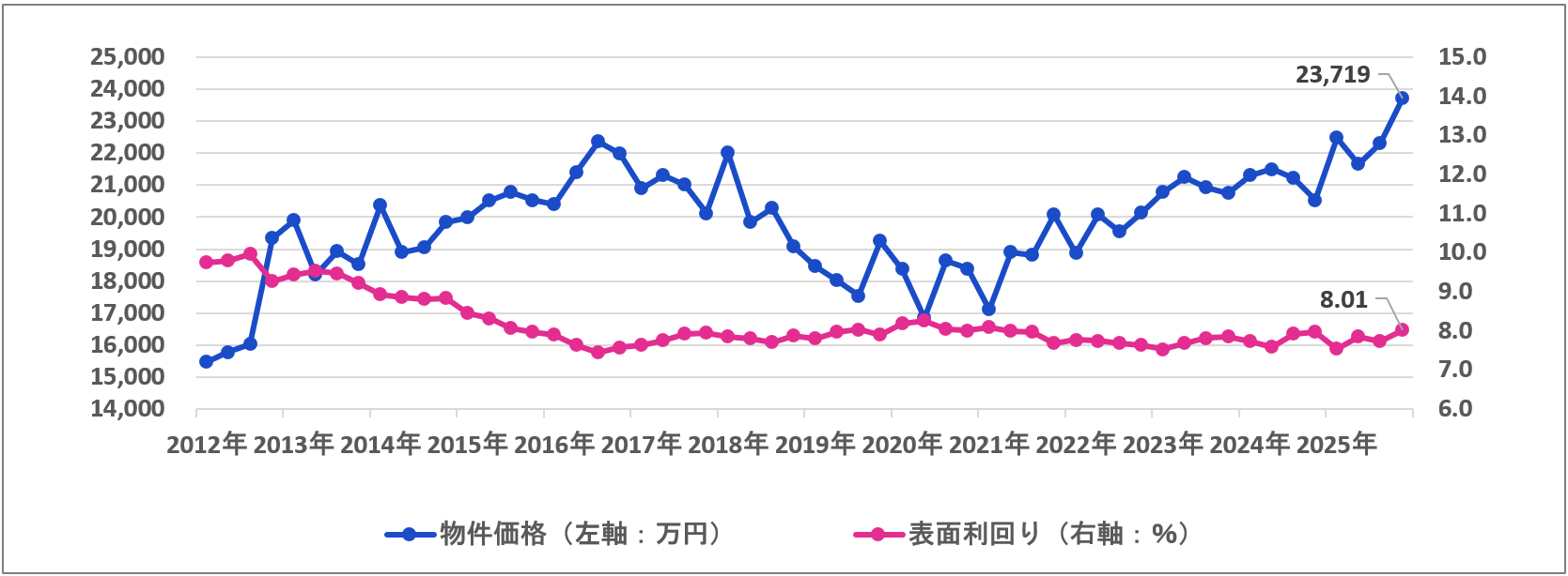 一方、平均利回りは物件価格が上昇したにもかかわらず、全種別で前四半期から上昇しました。特に都心部など賃貸需要の強いエリアを中心に賃料水準の上昇が進み、平均利回りを押し上げている可能性が考えられます。