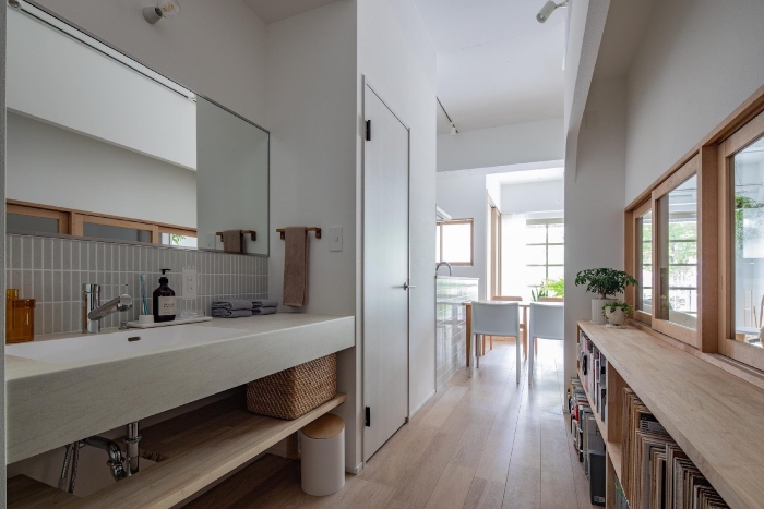 廊下洗面とは、名前の通り、洗面スペースをお風呂や脱衣所と一緒にするのではなく、廊下や部屋の一角に設置することです。リビングに入る前に手を洗うことができる衛生面や、来客があった際に水回りを見られる心配がないことなどから人気を集めています。