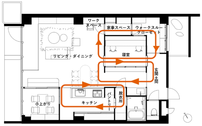 回遊動線とは、一つのスペースに複数の出入口を設けることで、家の中を行き止まりなくし、スムーズに移動できる動線を指します。家事や日常生活の効率が向上し、大幅な時短を実現できます。