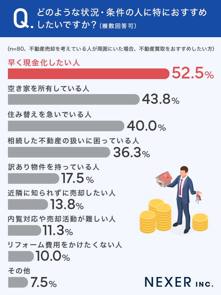 続いて、不動産買取をおすすめしたいと思うのはどのような状況や条件の人かを聞いてみました。