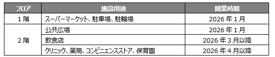 商業店舗は合計10テナントが入居を予定しております。2026年1月にスーパーマーケットが開業し、3月以降その他テナントも順次開業していきます。また公共広場においては、エリアマネジメント組織により、約350インチの大型デジタルサイネージを活用し、地域のニュースや防災情報、スポーツの放映なども予定しており、キッチンカーの誘致も検討しております。