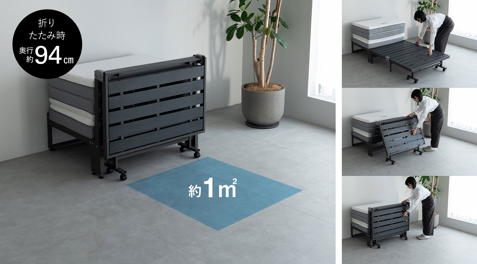 独自構造により、折りたたみ時もヘッド下には収納スペースを確保。さらに、折りたたんだフレームが低めの間仕切りのように機能し、マットレス・布団や枕まで視界から隠すことで生活感を抑え、すっきりとした空間を保てます。来客用スペースと寝室を兼用したい1Rや1K、1LDKなどの間取りで活躍が期待できます。