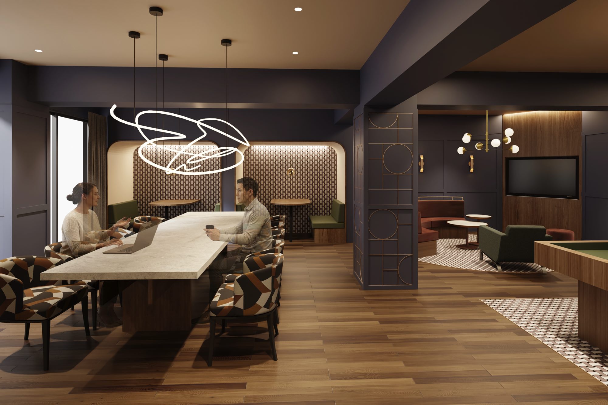 日中はワーキングラウンジ、夜はくつろぎのラウンジとして利用できる多機能スペース。