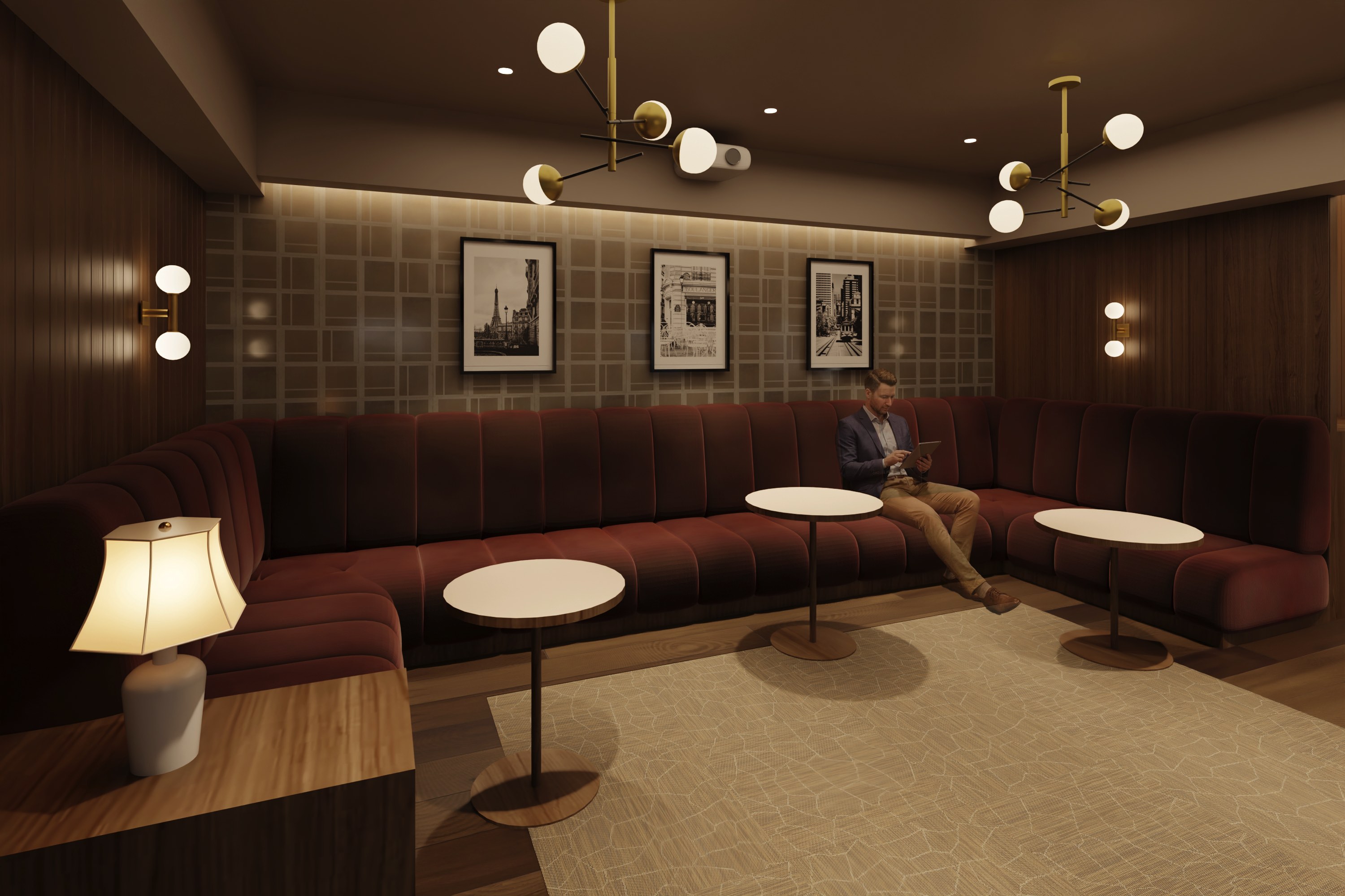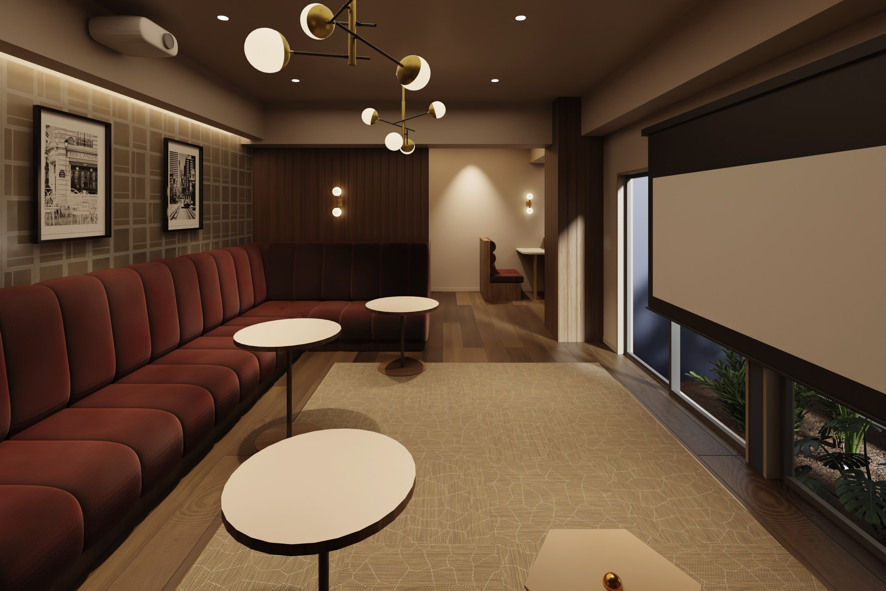 調光照明付きのソファ席では、大画面スクリーンを降ろしシアタースペースとして映像鑑賞を楽しむことができます。