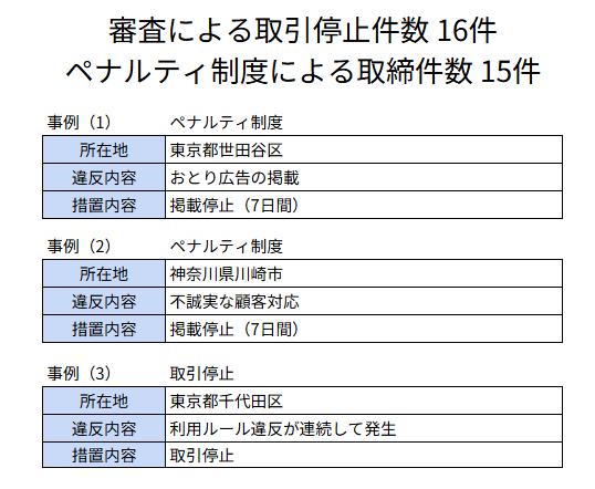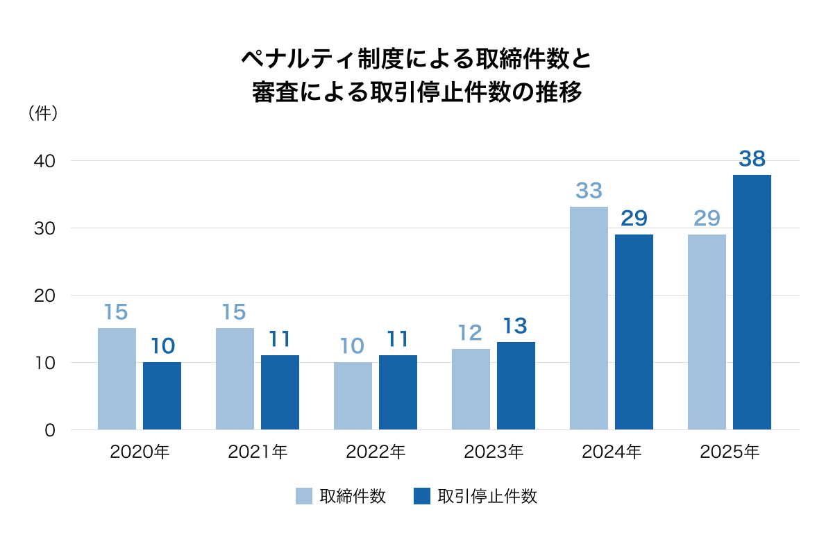・2025年下半期は、審査による取引停止件数が16件、ペナルティ制度による取締件数が15件