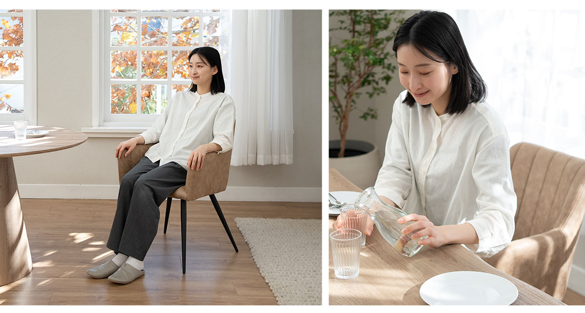 シンプルながら程よいデザイン性を備えた木製脚が、ダイニング空間をスマートに引き締めます。