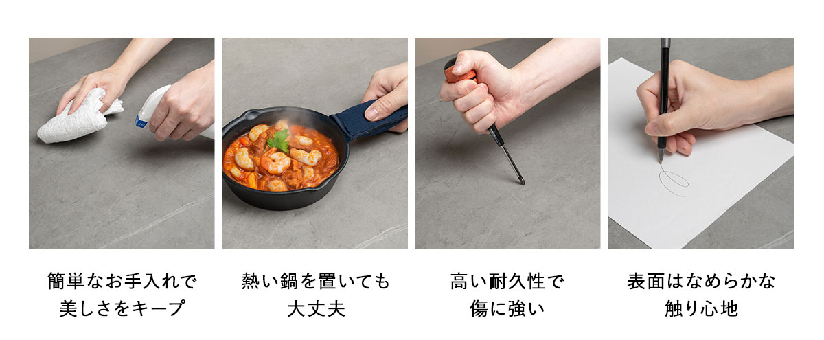 耐久性とメンテナンスのしやすさから、料理を楽しみたい方はもちろん、ダイニングでお仕事やお子様の勉強を考えているご家庭でもオススメです。