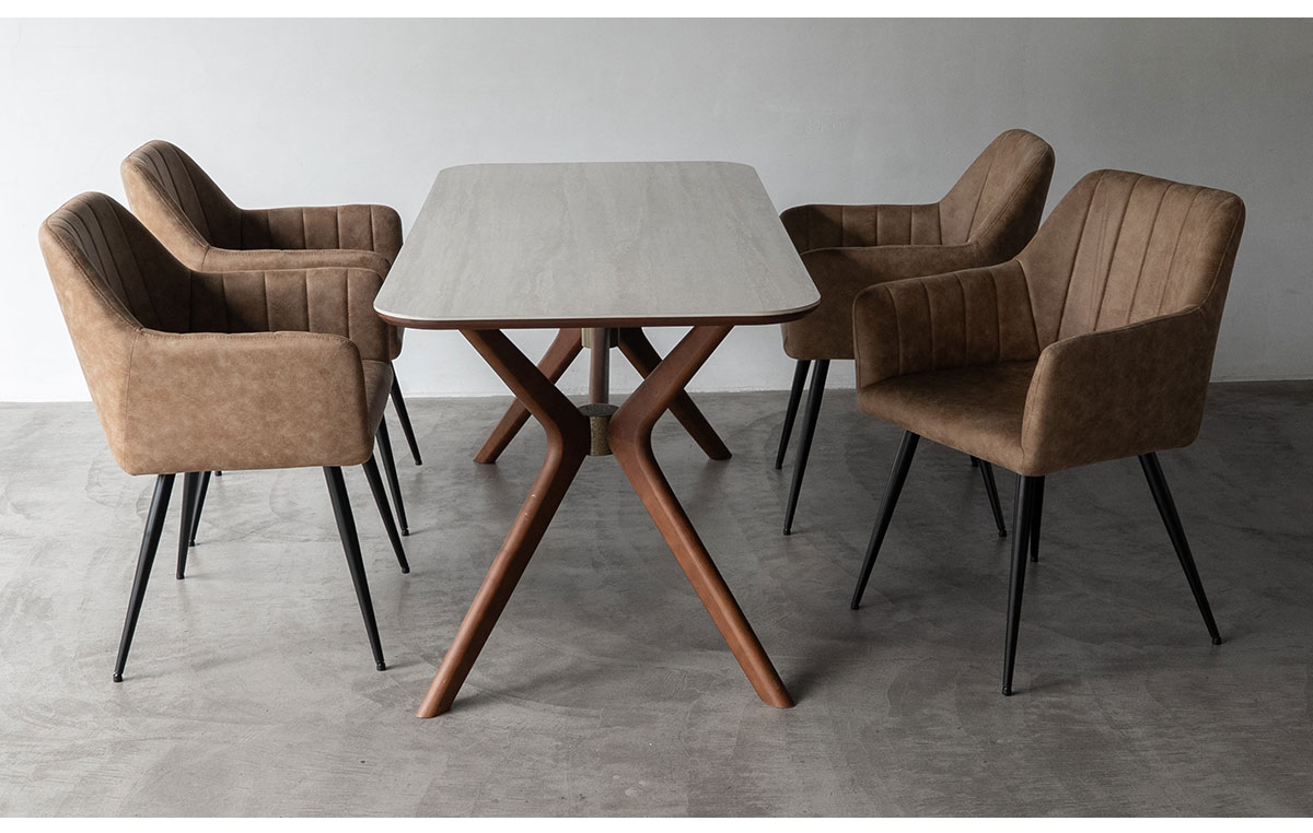 手軽にダイニング空間のコーディングを楽しめる5点セットもご用意しました。セラーノと相性の良いダイニングチェアを4脚