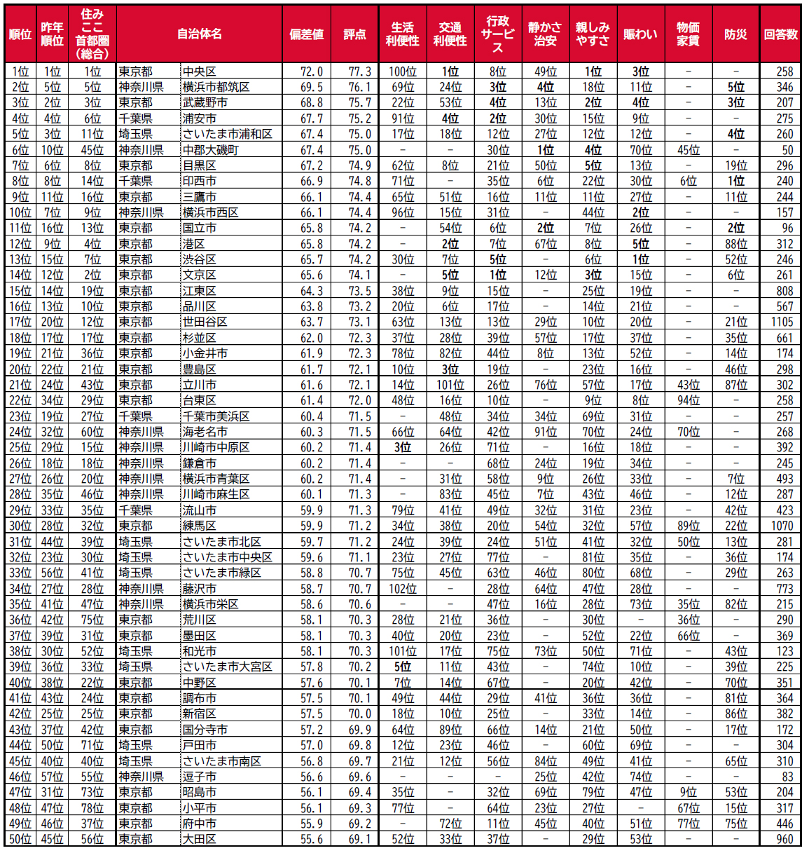 ※住みここ首都圏(総合)の順位は、2025年5月14日に発表した「街の住みここちランキング2025<首都圏版>」の順位を表記しています。
