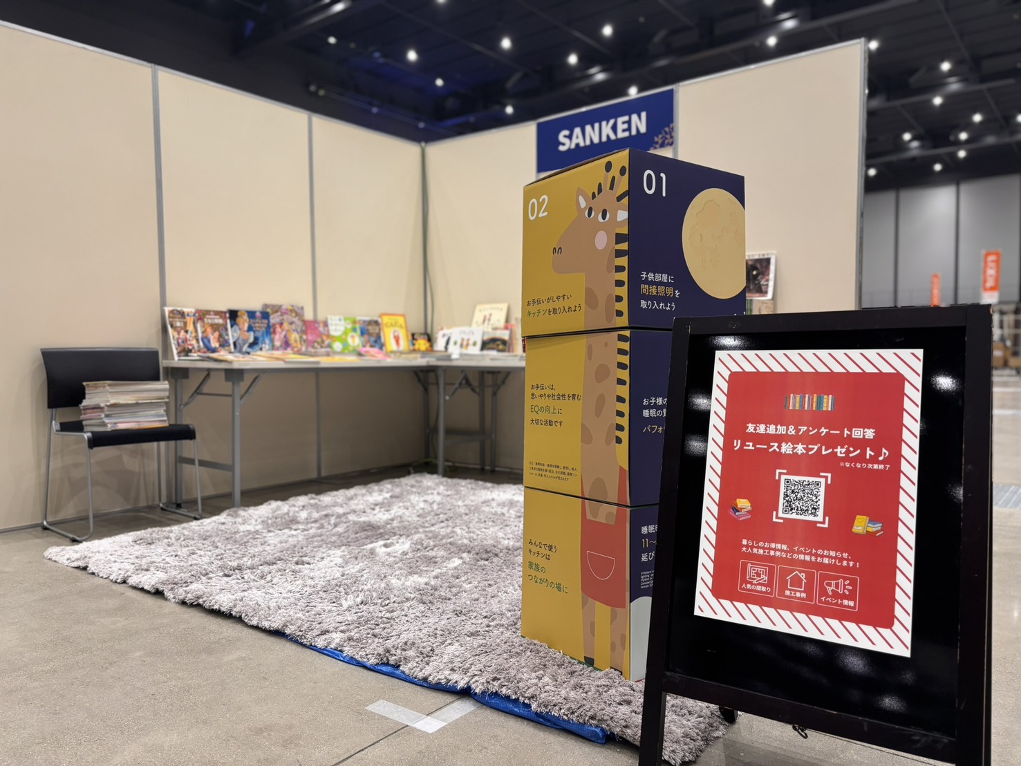 会場内でひときわ親子連れの笑顔が集まったのが、絵本未来創造機構・高井先生による読み聞かせプログラムです。本セッションでは、最初の30分間、高井先生が大人気の絵本をゆったりと読み聞かせ、子どもたちは物語の世界に引き込まれていきました。読み聞かせの後には、高井先生と三建の小見氏、荒巻氏が登壇し、知育に関する住環境講座のトークセッションを開催。絵本を通じて子どもの感性や想像力を育む大切さ、そして住まいの環境が子どもの発達や学びにどのような影響を与えるのかについて、三者それぞれの視点から意見を交わしました。トークでは、空気環境や照明計画のあり方など、家庭での“日常空間”が知育の可能性を広げる重要な要素であることが、研究データや具体例を交えながらわかりやすく紹介され、来場者は熱心に耳を傾けていました。また、SANKENブースでは、知育の一環として「絵本のリユースコーナー」を設置。もう使わなくなった絵本を集め、自由に手に取って読んでいただけるミニ図書館として展開しました。親子で絵本を選び、ページをめくる穏やかな時間が生まれ、「絵本を通じた学びと循環」を体感できる場として、多くの来場者に好評をいただきました。