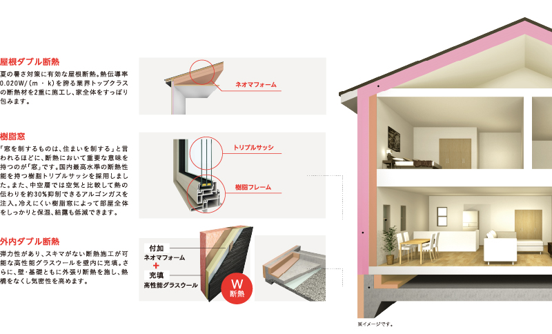 住まい全体の温度差を少なくすることで熱中症予防やヒートショックのリスクを低減し、健康にも配慮した住まいです。