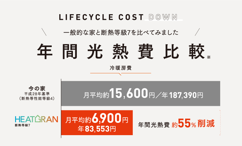 ※上記数値を保証するものではありません。参考値としてご確認ください ※冷暖房設定:全館連続運転/暖房設定室温:25℃/冷房設定室温:24℃ 電気料金:1kWhあたり39.5円で試算 ※当社調