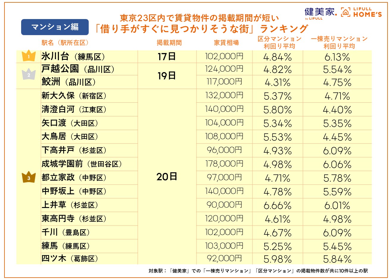事業を通して社会課題解決に取り組む株式会社LIFULLのグループ会社であり、不動産投資と収益物件の情報サイト「健美家(以下、健美家)」および「LIFULL HOME’S 不動産投資」を運営する健美家株式会社(代表取締役社長:成瀬 亮輔)は、株式会社LIFULLが運営する不動産・住宅情報サービス「LIFULL HOME’S」のデータを活用し、賃貸物件の掲載期間をもとに東京23区内の賃貸マンション・アパートの借り手がすぐに見つかりそうな街ランキングを発表しました。