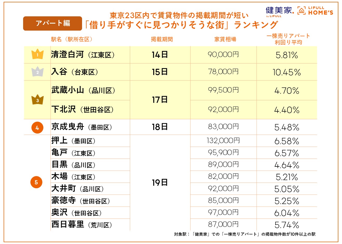 アパート編:1位は「清澄白河」で掲載期間は14日 城東・城南エリアが上位に