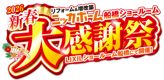 全国100店舗以上展開!2026年に創業39周年を迎える、リフォーム&増改築 ニッカホーム株式会社 (本社:愛知県名古屋市緑区篭⼭、代表取締役社長:西田裕久、以下 ニッカホーム)の ニッカホーム船橋ショールーム が主催の「新春大感謝祭」を、LIXILショールーム船橋 にて開催します!1月24日(土)、1日限定のイベントですので、この機会をお見逃しなく!