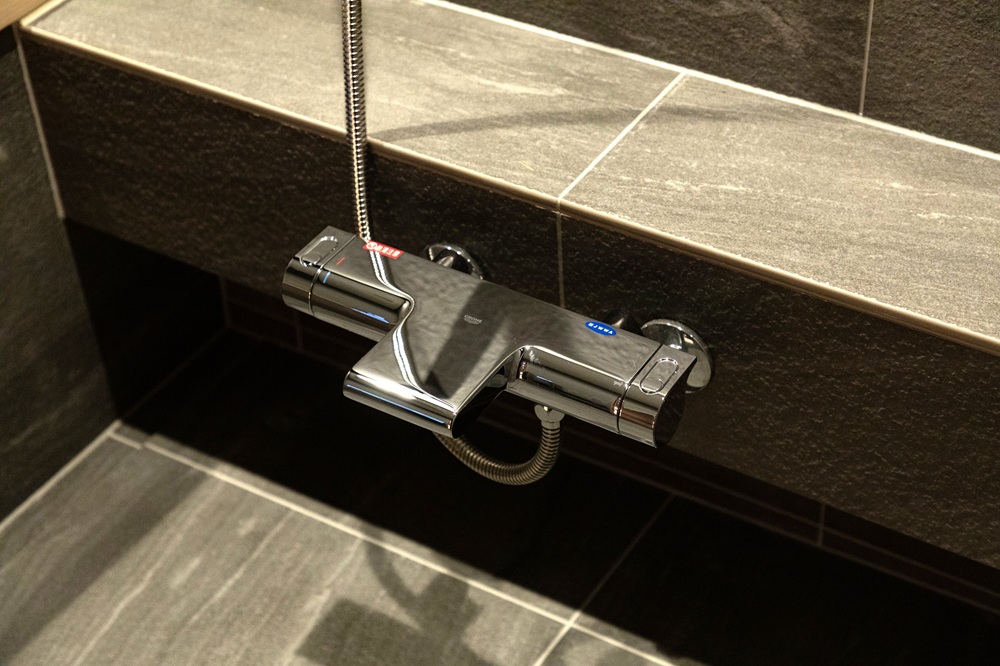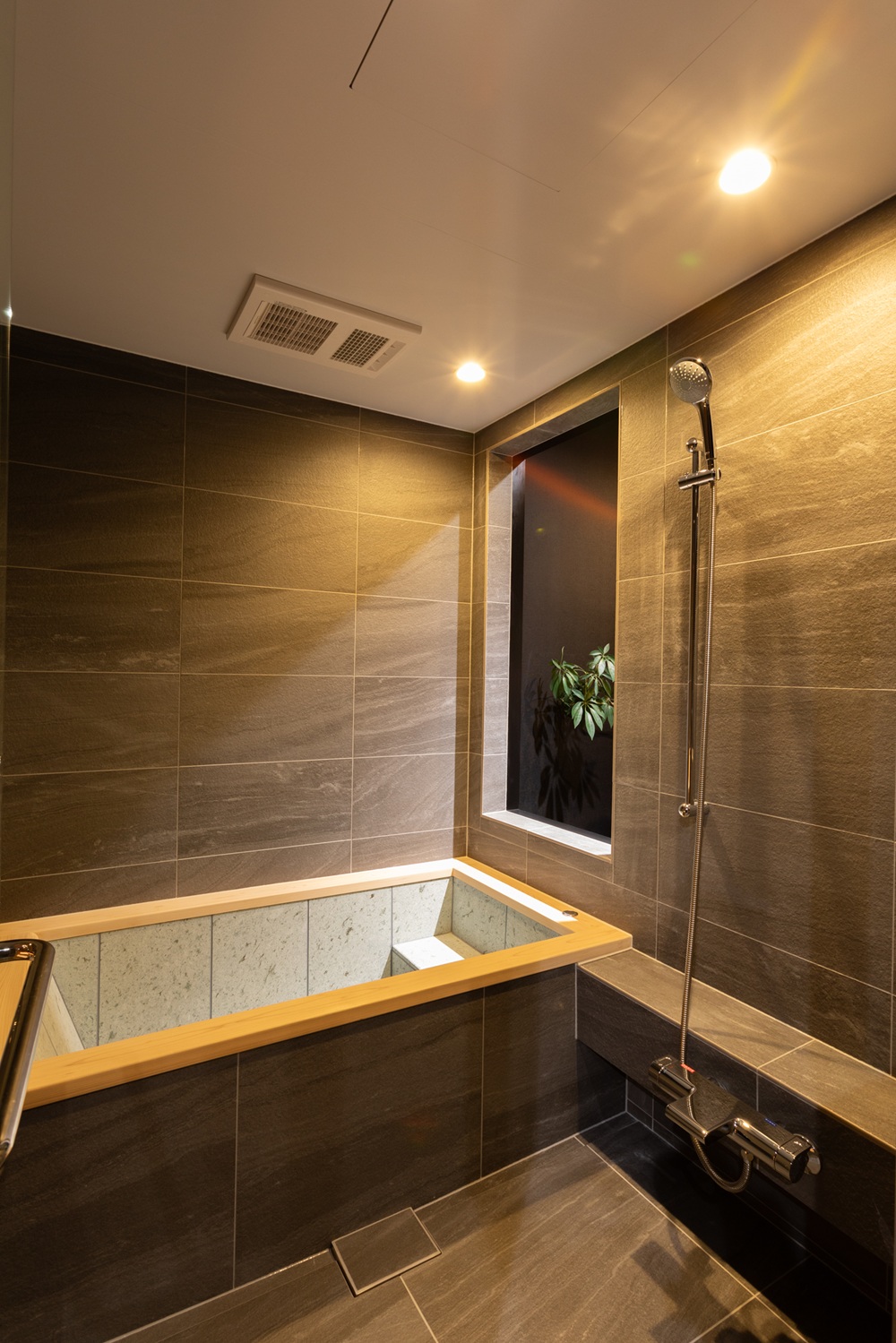 空間全体にはタイル貼り仕上げを採用し、素材感と意匠性にこだわった上質な浴室空間を実現しました。