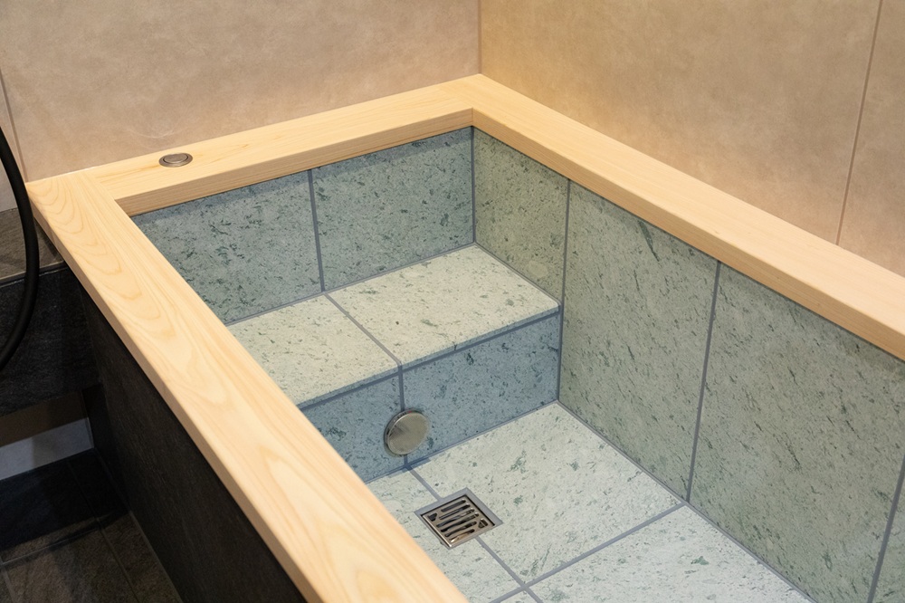 オーバーヘッドシャワーによる包み込まれるような浴び心地に加え、浴槽にはWABUROの象徴である石貼り浴槽を標準装備しています。