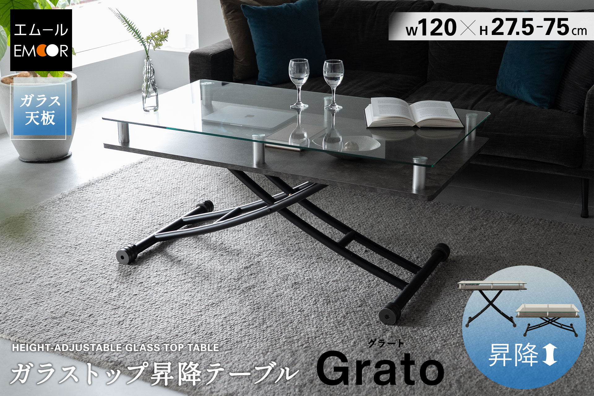 ガラストップ昇降テーブル「Grato(グラート)」