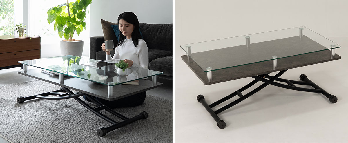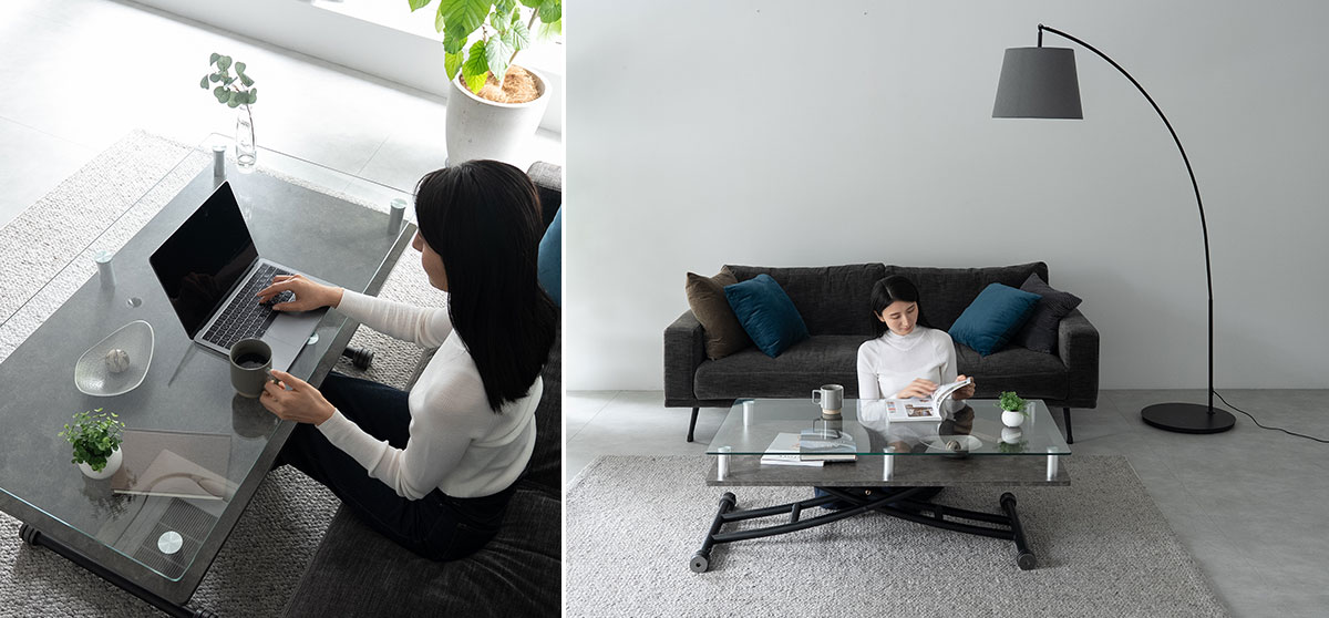 ガラスの透明感がリビングを上質に彩り、昇降機能が暮らしの幅を広げる。ソファにも床生活にもフィットする、デザイン性と実用性を兼ね備えたガラストップ昇降テーブル「Grato(グラート)」が新登場!
