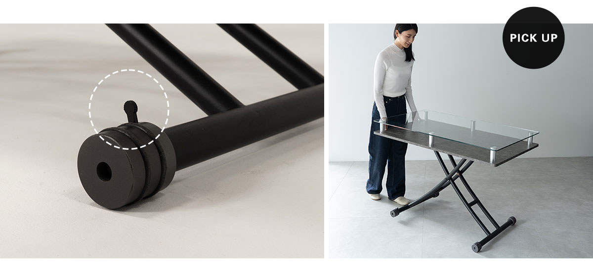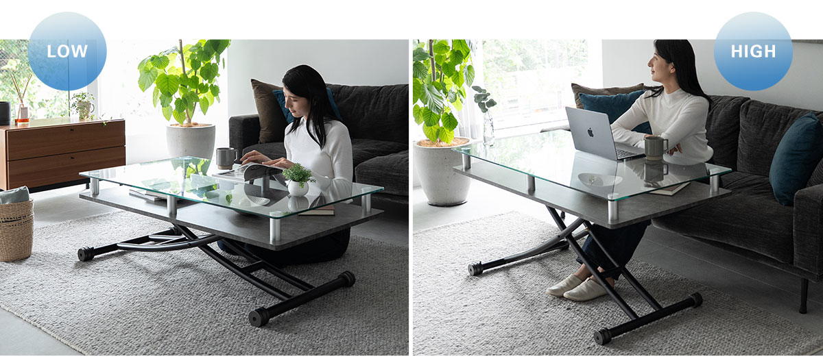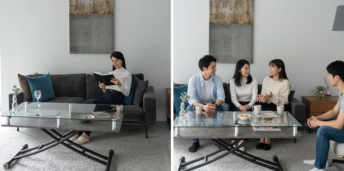 ガラストップ天板による高級感と、昇降機能による高い実用性を兼ね備えたリビングテーブル。