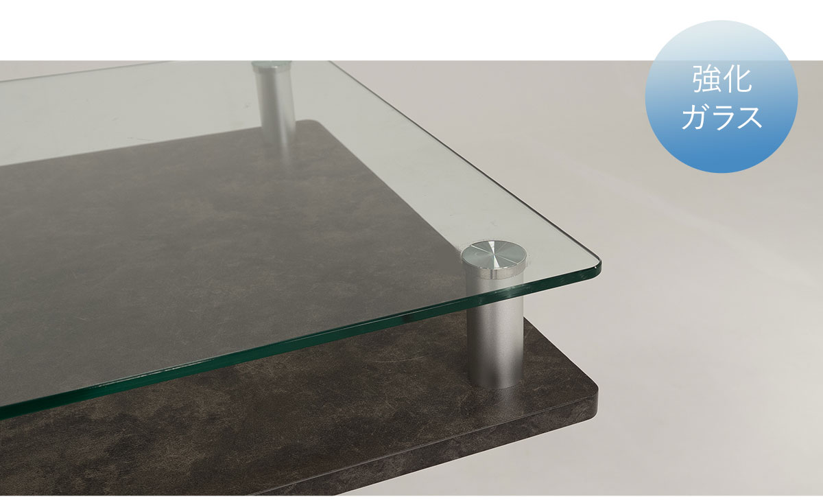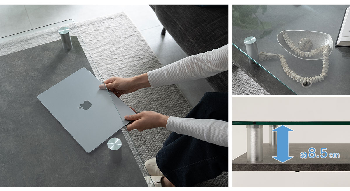 ガラス天板は強化ガラスを採用。お気に入りの雑貨や小物をディスプレイすれば、テーブルそのものがインテリアの主役に。透明感のあるガラス天板越しに、収納物を美しく魅せることができます。