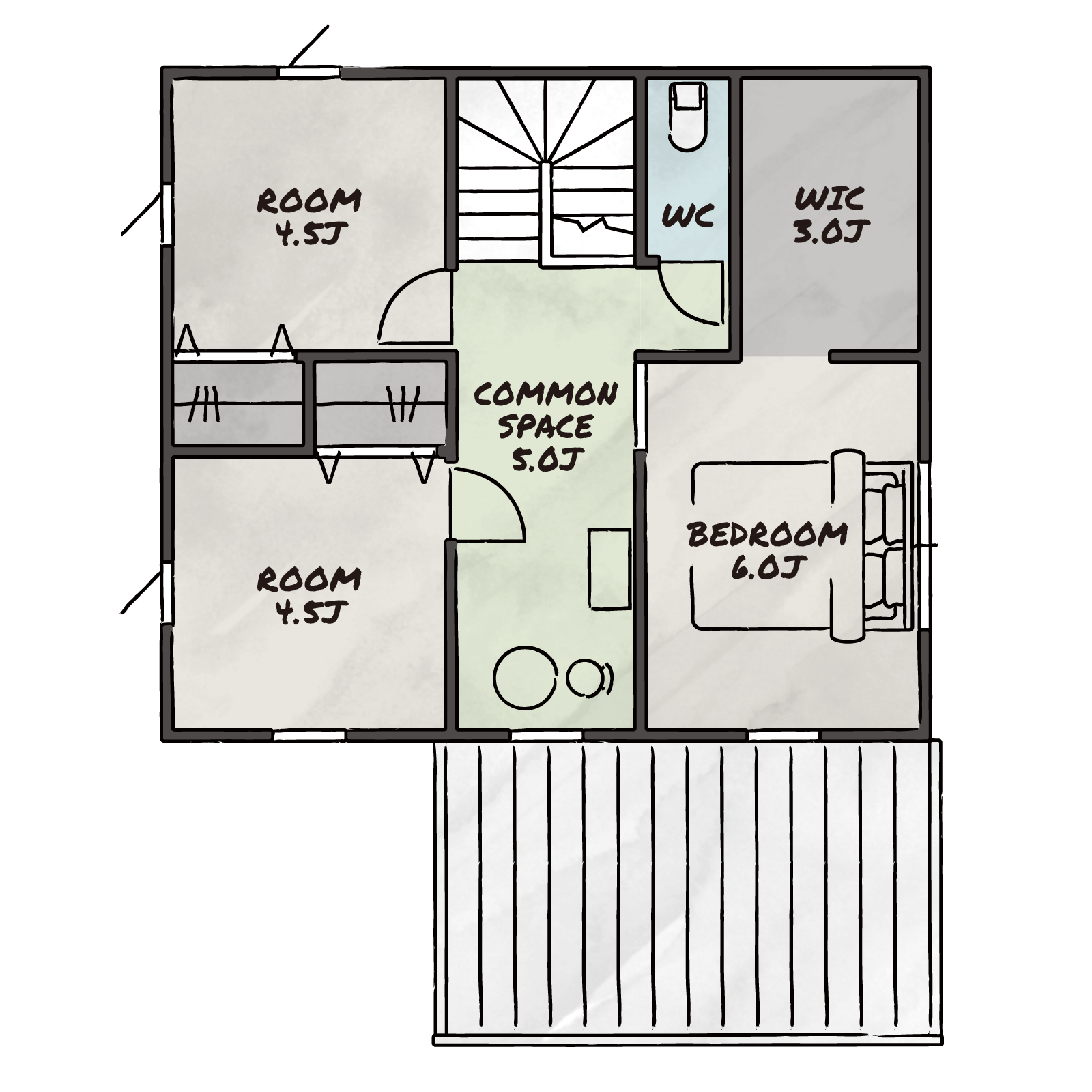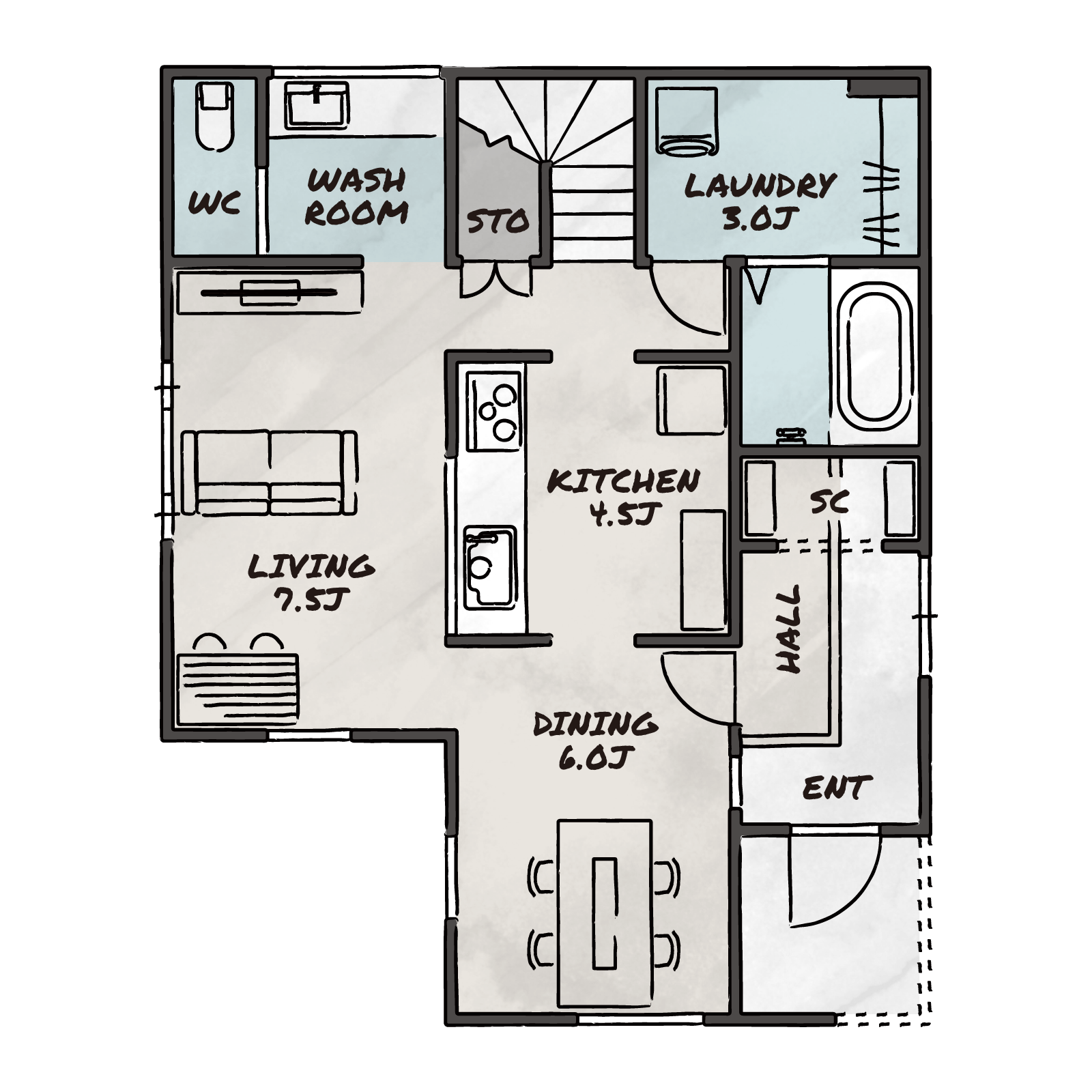 家族の暮らしを中心に考えた間取りは、南面に配したダイニングが個室的な落ち着きを演出し、毎日の食事シーンを心地よく彩ります。中央に配置されたキッチンは、ダイニングやリビングと自然に繋がり、家族とのコミュニケーションが生まれる中心の空間です。リビングにはダルトンの家具を使ったカウンターを設け、軽い食事や読書、趣味の時間も楽しめます。ゆったりとした洗面、SCやランドリー、2階のコモンスペース、WICなど、日常の動線や収納も考慮。暮らしの中の様々なシーンを柔らかく繋ぎ、家族の時間を豊かにするプランです。