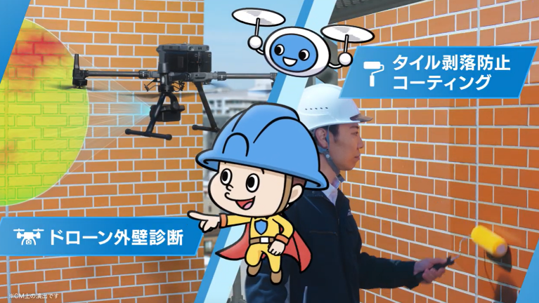 CMでは、増加する外壁落下事故のリスクを訴求し、新しい点検方法としてドローン診断技術の認知拡大を目指します。