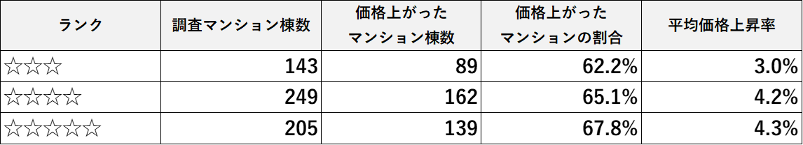 大阪府・京都府・兵庫県の分譲マンションを対象とした分析では、評価が最も高い「星5つ」のマンションの約7割で価格上昇が確認され、平均上昇率は4.3%に達しました。「星4つ」も同様に高水準の結果を示す一方、「星3つ」では価格上昇割合・上昇率ともに大きく低下しています。これらのデータは、「評価が高い」すなわち「管理状態が良好」であるほど、資産価値が維持・向上しやすいことを明確に示しています。